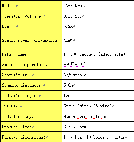 Brand: LEDON Operating voltage: DC12-24V Sensing ranges: 5-8m sensing principle: PIR Load: ≤2A Product Certification: CCC Output: Smart Switch (3-wire) Off delay time: 16-400 seconds Scope: automatic lighting hallways, corridors, bathrooms, basements, warehouses, garages and other places and other purposes