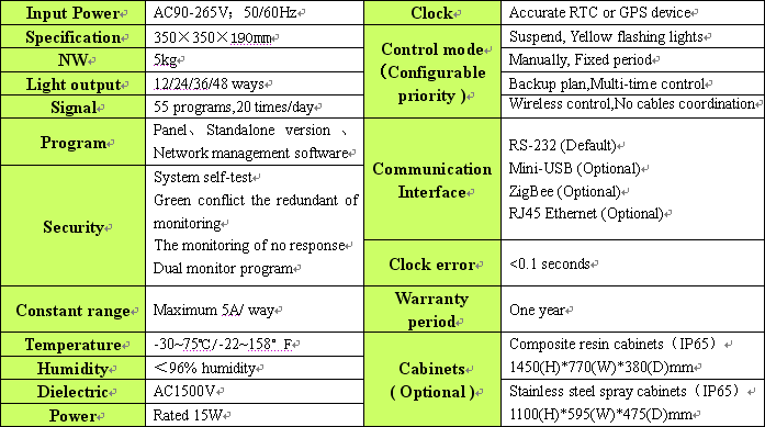 - Following the advantages of eight:●Advantage price●Indemnificatory●Security●Easy operation●Retractility●Configurability● Flexible scalability●Multilingual screenDescription:Controller uses ultrahigh brightness LED segment displays and LED crossroads Mimic screen display the Interface component, with RS-232, RS-485, Real-time communication countdown, Mini-USB, GPS equipment, Wireless remote control, Wireless networking, 10 / 100M Ethernet, Remote 2G / 3G networking, Wireless hand control, Digital dimming,SMB, etc. function Interface.Features:◆ Data automatic storage for more than 10 years, the user optional anti-radiation program memory;◆ Especially the dual-core system design, to avoid all kinds of unpredictable reasons that system crashes cause the traffic gridlock;◆ Be occurred the error automatic software or hardware downgrade to process and issue an error alarm and event records;◆ Equipped with USB and RS-232 for easy connection to a computer for manages upgrades, wireless or RS-485 can be connected to 32 real-time the communication countdown screen;◆ Complete self-test, error detection, error correction and monitoring system that can comfortably withstand a variety of outdoor environments interference;◆ Based on the GPS latitude and longitude true solar time, calculate the every day's sunrise and sunset time for the positioning and dimming function;◆ Support the 8 kinds of manual mode seamless switching control; almost covering the traffic police required the mode of temporary control;◆ Active or passive the two-way green wave control, full / half-sensing control、multi-time control、fixed-cycle control、yellow flash control and so on;