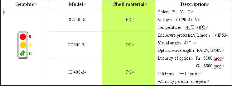 CD400-3 LED Lane traffic lights, generally used in toll stations, tunnels, ports, parking lot and other traffic road lights, With high efficiency, long life; high temperature resistant, resistance to vibration, low power consumption, moisture, dust Etc. features.