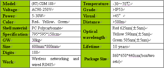 RT-CDM the single red countdown are using isolated RS485 and access to Wireless Mesh Networks constitute of the LANs, offers 255 nodes、250K rate、1.5 km distance and the detection of digital damage, for the real-time、reliability、expansibility and so on needs to be carefully to design. Strictly enforcement of the road traffic signal countdown displays (GA/T 508-2004) the relevant standards.