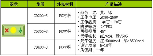 CD400-3 LED車道交通指示燈,一般應用于收費站、隧道口、停車場及其它交通道路指示,具有高效率、壽命長;耐高溫、耐振動、低功耗、防潮、防塵等等特點。